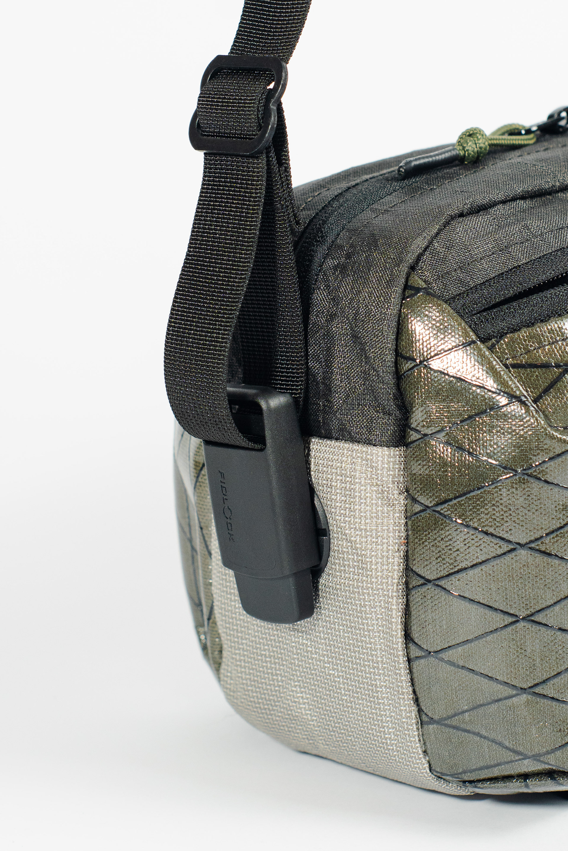 When the male fastener is at rest it creates a flat profile resisting snagging on anything else in the bag when the strap is disconnected.