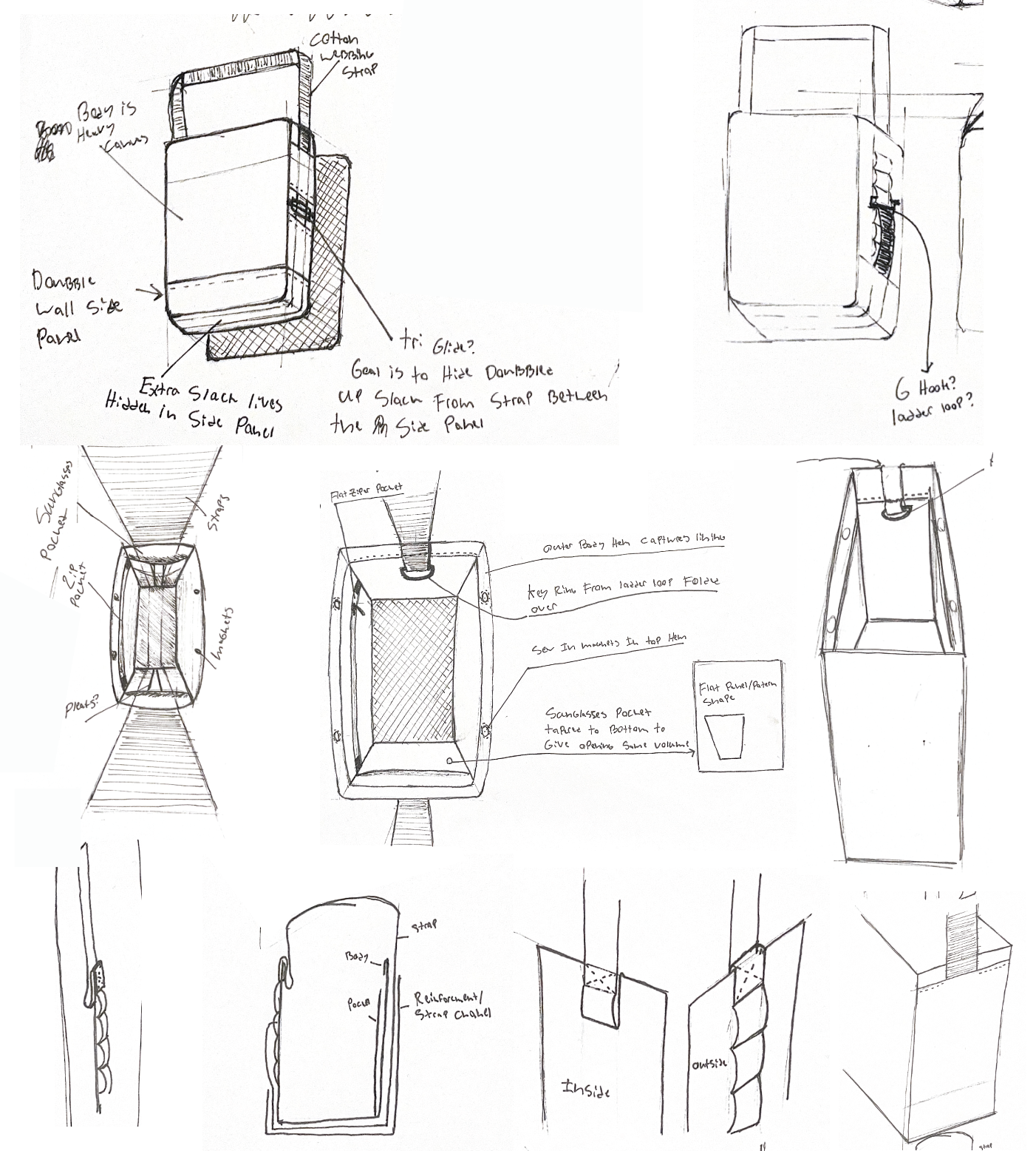 Taking inspiration from the mood board I decided to implement a passthrough panel allowing the strap to flow through the bag. Routing the strap through the side panel helps to keep the user free from snagging while still allowing adjustment for shoulder or crossbody wearing using the adjustment loops on the side panel.